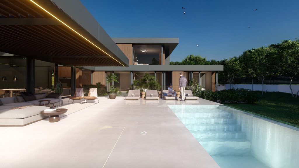 Se caracteriza por el gran espacio central de Salón Comedor Cocina a doble altura que dispone tambien de doble orientación solar. Sol de mañana alto de Este y Sol de tarde protegido por el porche que genera el volumen de habitaciones al Oeste.
